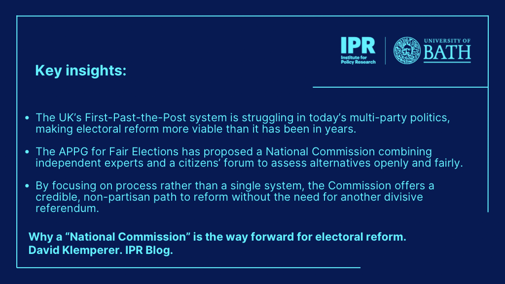 It is in this context that the recently-formed All-Party Parliamentary Group (APPG) for Fair Elections (which brings together over 130 MPs) has begun campaigning for the establishment of a “National Commission on Electoral Reform” – a new, time-limited deliberative body that would be set up by the government to assess the functioning of FPTP and to potentially recommend an alternative. Earlier this month, the APPG followed up its initial proposal by publishing a “Terms of Reference” for the mooted National Commission, sketching out some potential elements of its structure, remit, and process.